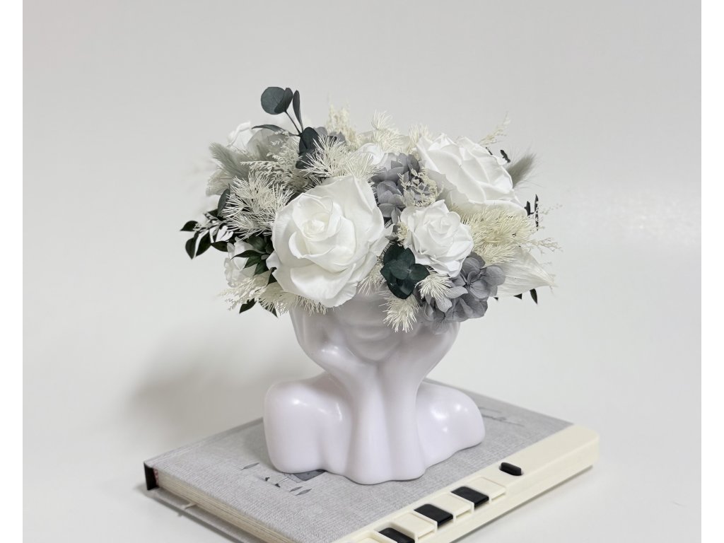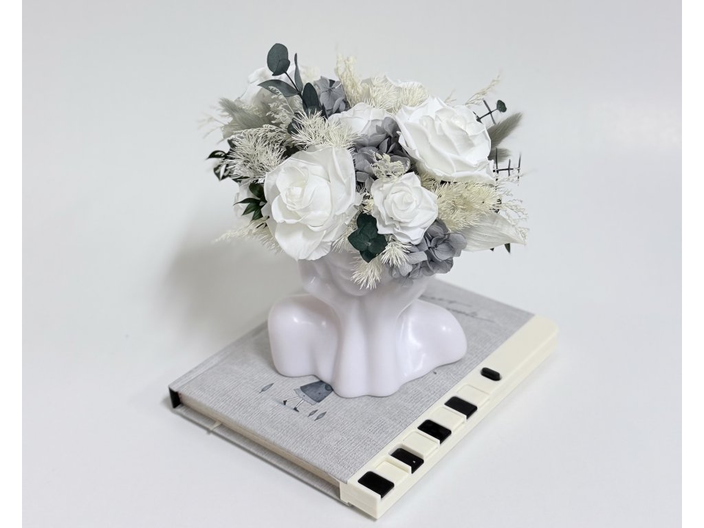 Luxusní aranžmá ve skulpturální bílé váze s bílými růžemi, jemnými texturami a decentní zelení. Čistá elegance pro moderní interiér i výjimečný dárek.