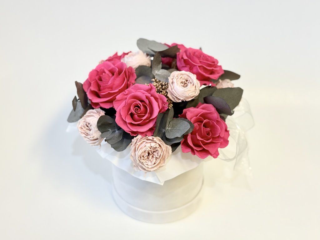 Elegantní květinová kompozice v bílé dárkové krabici – symbol čistoty a sofistikovaného stylu. Dokonalý dárek i výjimečný detail do interiéru.