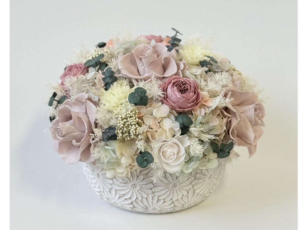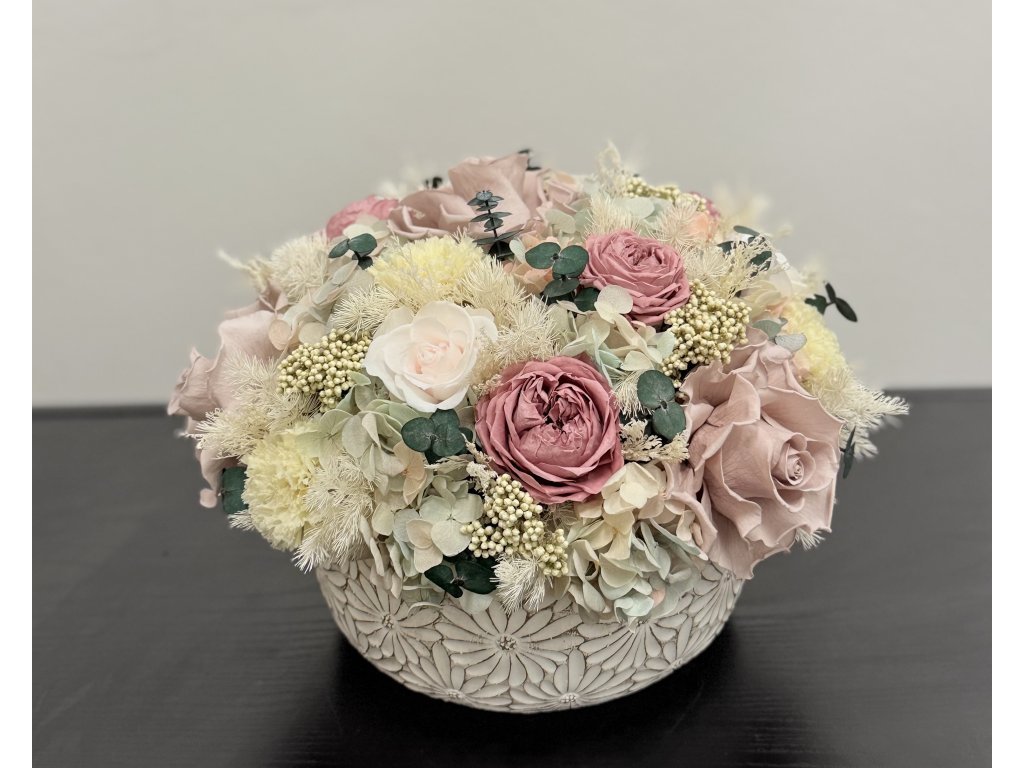 Luxusní kompozice v pudrových a krémových tónech s růžemi a jemnou zelení. Výrazný interiérový akcent a elegantní dárek, který doplní váš prostor.