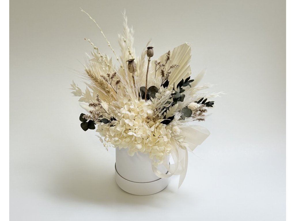 Elegantní kompozice ze stabilizovaných květin v jemných bílých a krémových odstínech symbolizuje čistotu, lehkost a nadčasovou krásu. Ideální jako sofistikovaná dekorace nebo stylový dárek.