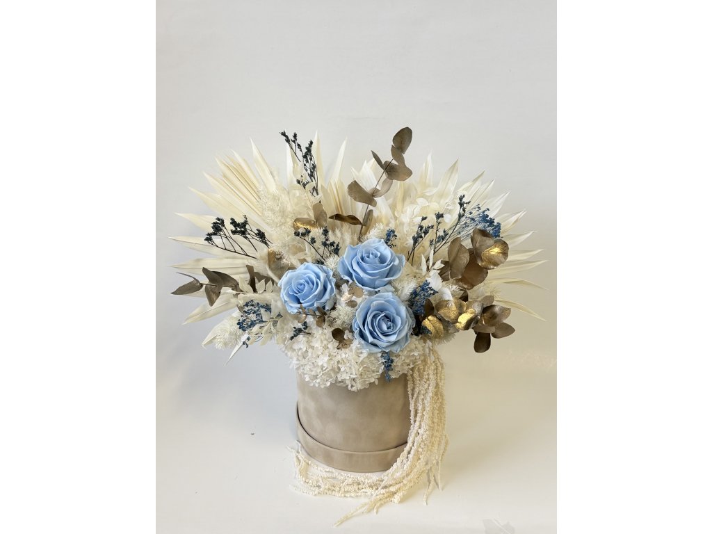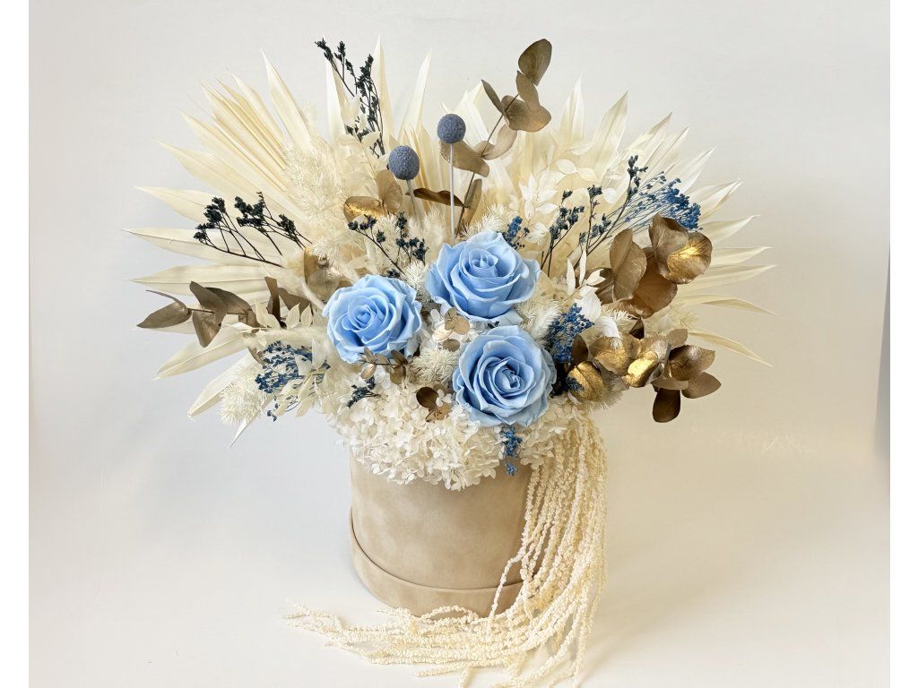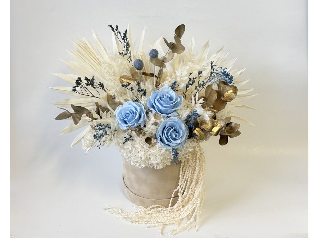 Ručně vytvořená kompozice ze stabilizovaných květin si zachová svůj krásný vzhled až do 3 let.